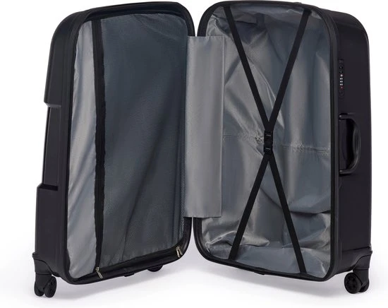 De koffer is niet alleen prachtig mooi, maar ook van de beste kwaliteit. De koffer is namelijk gemaakt van 100% polypropyleen en dat is het sterkste materiaal dat er is. Jouw reiskoffer is dus ijzersterk, zonder zelf onnodig zwaar te zijn. Lichtgewicht reizen? Check! Naast de stijlvolle & stevige buitenkant, is uiteraard ook de binnenkant optimaal ingericht. Twee ruime compartimenten voor al jouw essentials en net dat beetje meer. De binnenkant is namelijk voorzien van aan de ene kant een rits en aan de andere kant handige inpakkriemen. Zo blijven jouw outfits tijdens het reizen netjes op hun plek. Perfecto!