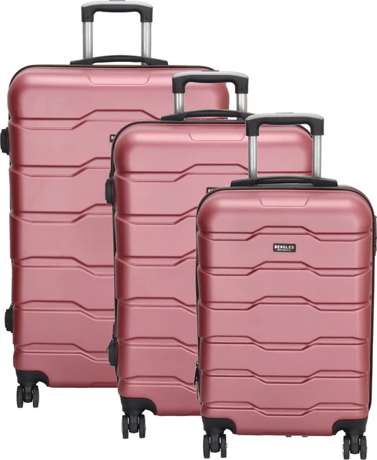 Mooie 3-delige hardschalen (ABS) kofferset van Beagles Originals. Koffers zijn binnenin gevoerd, voorzien van spanbanden en een tussenschot met rits. Comfortabel door 4-wiel systeem. De koffers maat L en M hebben een handvat aan de bovenkant én op de zijkant. Op de handbagage koffer (maat S) zit alleen een handvat aan de bovenkant. Alle koffers hebben een vast cijferslot op de zijkant van de koffer.