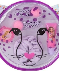 Dit is echt een beestachtig zoete beauty set: in het transparante ronde tasje met oortjes en een luipaardgezicht zitten 2 metalen haarspeldjes met een pompon, 1 panter scrunchie, 1 lipgloss met appelgeur (doosje, 2,8 g inhoud) en een roze lipgloss met de geur van blauwe bessen (tube, 5 ml inhoud).