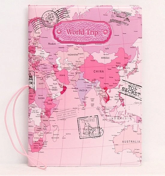 Leuk paspoort hoesje met de afbeelding van de wereldkaart in de kleur roze, om uw paspoort te beschermen. Met extra beveilingselastiekje en creditcard hoesje aan de binnenkant.