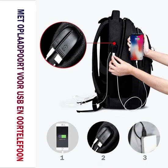 Handig USB-Poort & Hoofdtelefoon Jack-Ontwerp – De USB-oplaadbare school rugzak met ingebouwde USB-oplader aan de buitenkant en ingebouwde oplaadkabel aan de binnenkant, deze USB-rugzak biedt u een handigere manier om uw telefoon tijdens het lopen op te laden. Houd er rekening mee dat deze rugzak niet de powerbank zelf bevat, de USB-oplaadpoort biedt alleen een gemakkelijke toegang om op te laden. Een gat voor de koptelefoon aan de buitenkant geeft gemakkelijk toegang tot het gebruik van de oortelefoon. vrij.