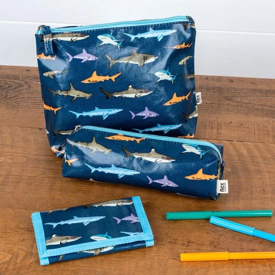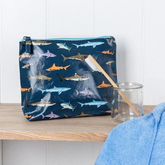 Mooie, stevige kinder toilettas gemaakt van PVC/ Tafelzeil. De toilettas is voorzien van een stoere print met haaien. De toilettas heeft 1 groot vak en een stevige rits.