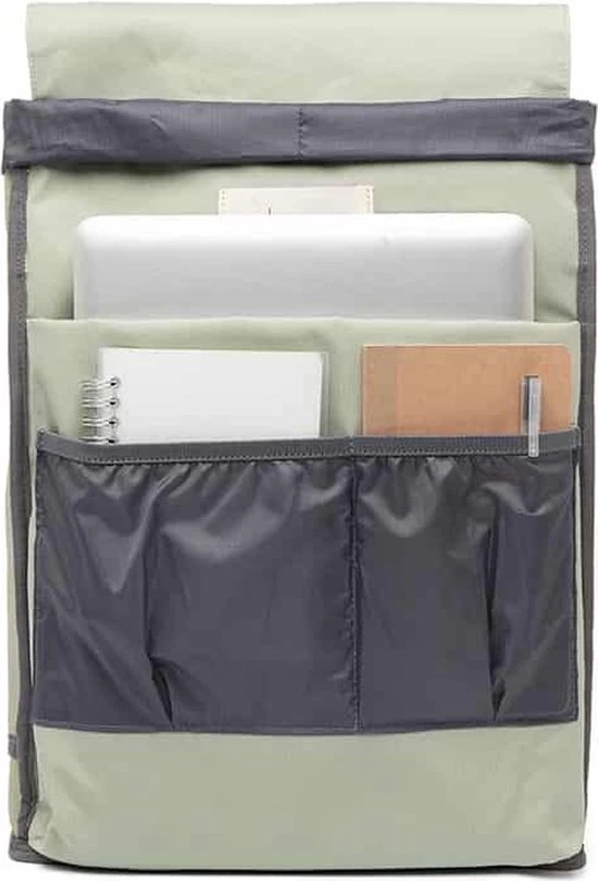 Je opent de rugzak met de metalen musketonhaak aan de voorzijde. Als extra sluiting kan je ervoor kiezen om ook het koord onder de flap extra aan te trekken. Binnenin de tas heb je de mogelijkheid om je spullen geordend op te bergen in de twee steekvakken of het gewatteerde13,6 inch laptopvak. Onverwachte regenbui? Geen paniek want deze tas is waterdicht! Perfect voor wanneer je een dag op pad bent.