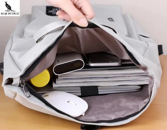 In het hoofdvak, vindt u ook een opberg vak voor uw laptop/ of tablet. Deze biedt veel opbergruimte door dat de hoofdvak eenvoudig te vergroten of verkleinen is door het oprol gedeelte aan de bovenkant.