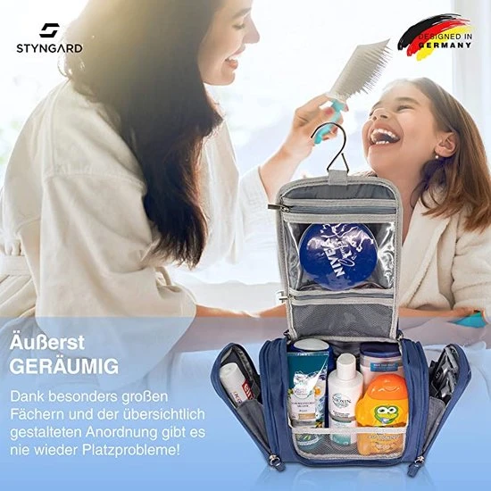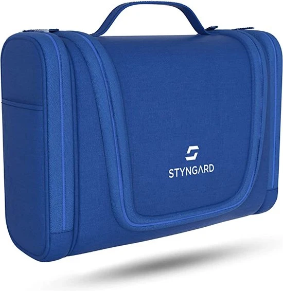 - Eenvoudig en elegant: in de hotelkamer of in de badkamer thuis geen ruimte om de toilettas neer te zetten? Geen probleem met de STYNGARD toilettas, deze is ook op te hangen. Met de scheurvaste haak hang je je toilettas gewoon naast de wastafel op.