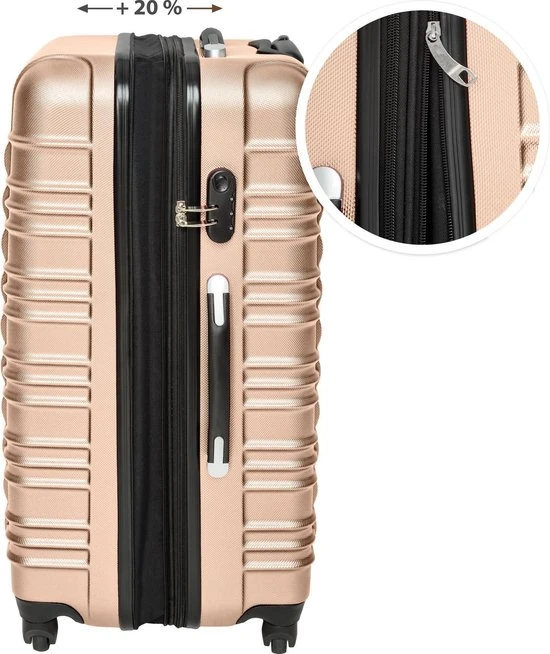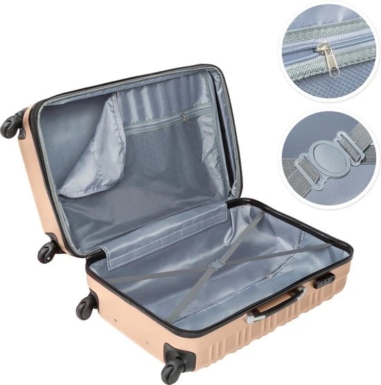 Uw nieuwe perfecte reisgenoot – of het nu voor vakantie, een korte trip, een zaken- of wereldreis is. Onze ultralichte bagageset schittert met vele pakmogelijkheden. Door de dwarsriem en een scheidingswand met extra gaasvoorvak blijft geen van uw wensen onvervuld. Het 2-voudig in de hoogte verstelbaar aluminium telescopisch handvat en de 4 360°-wielen evenals de ergonomische handgrepen aan twee kanten vergemakkelijken uw reisweg. Nog een voordeel voor u: door de ingebouwde dubbele rits kan het volume van de koffer flexibel met maar liefst 20% vergroot worden. De harde schaal van ABS-kunststof is heel robuust en beschermt tegen schokken en stoten bv. op de bagageband of bij de check-in.
