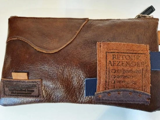 Gemaakt van een patchwork van bruin leer met blauwe accenten. Met klein vakje voorop van suede met stoere stempel. Handig voor al je spulletjes.