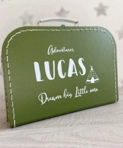 Kinderkoffertje met naam en tekst : “adventure” Afmeting: 25x18x9 cm (lxbxh). Leuk kom cadeau te geven om ter bekend making van jullie zwangerschap of om mee te geven als logeerkoffer. Kleur van de koffer naar keuze.